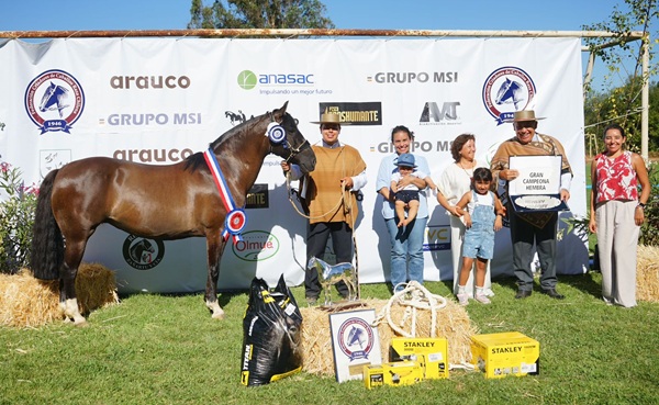 Campeona Yegua Mayor: Arcángel Gabriel Favorita. N° de Inscripción: 265685. Fecha de Nacimiento: 14-04-2016. Padre: Santa Elba Comisario. Madre: Corrales de Piedra Rodaja. Criador y Expositor: Juan Carlos Pérez Orellana.